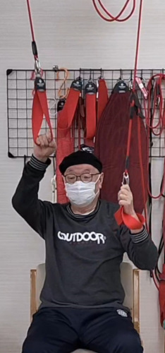 午後はデイサービスでリハビリに励みました。金曜日はスリングセラピーからです。今回は9種類の運動について、一つひとつの効果を確かめながら丁寧に行うことを目標に掲げました。