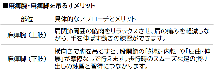 麻痺脚を吊るして非麻痺脚を持ち上げる筋力強化の動作では、それを支えようとする吊るされた麻痺脚の体幹も鍛えられることに気づいた。複合的な効果もあるようだ。