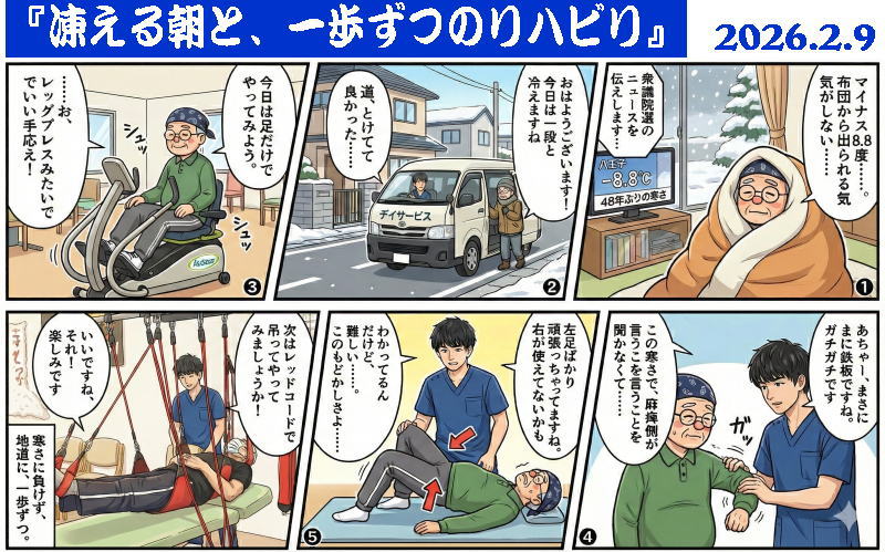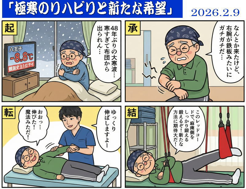 ここ最近の厳しい寒さで右麻痺側の腕には痙縮と巻き肩が強く出ており、まさに「鉄板が入ったようにガチガチ」の状態です。