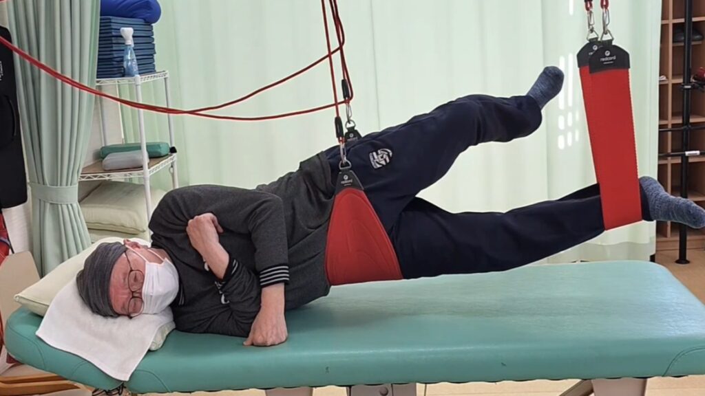 給水休憩をしていると個別ケアの声掛けがありました。今日は前回と違うセッティングで、健常な方の脚を上にして横になり、腰を吊り浮かせる姿勢をとりました。そこから両脚を麻痺足の下に入れ、一緒に吊り上げながら動かす「側臥位での股関節外転運動」を最初に行いました。