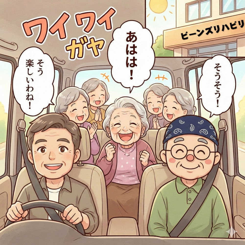 金曜日の送迎車には5人のご婦人方が乗っており、中でも93歳のご婦人が一番お元気です。「ワイワイガヤガヤ」と話がまとまらないほど賑やかで、あっという間に施設に到着しました。