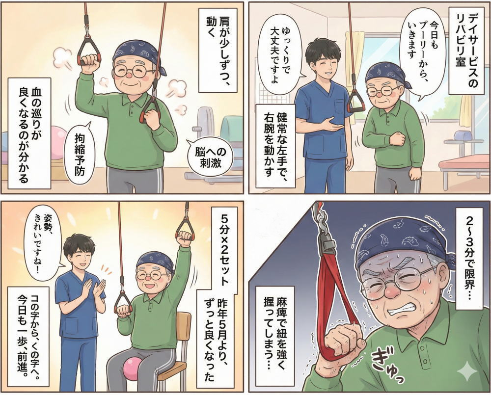 プーリーを始めた昨年5月頃に比べると、姿勢も良くなり、明らかに右麻痺腕の痙縮が和らいでいます。これは大きな前進だと感じています。これからも継続し、腕の状態を「コの字」から「くの字」へ、肘の曲がり具合が少し緩やかになるよう改善していきたいです。