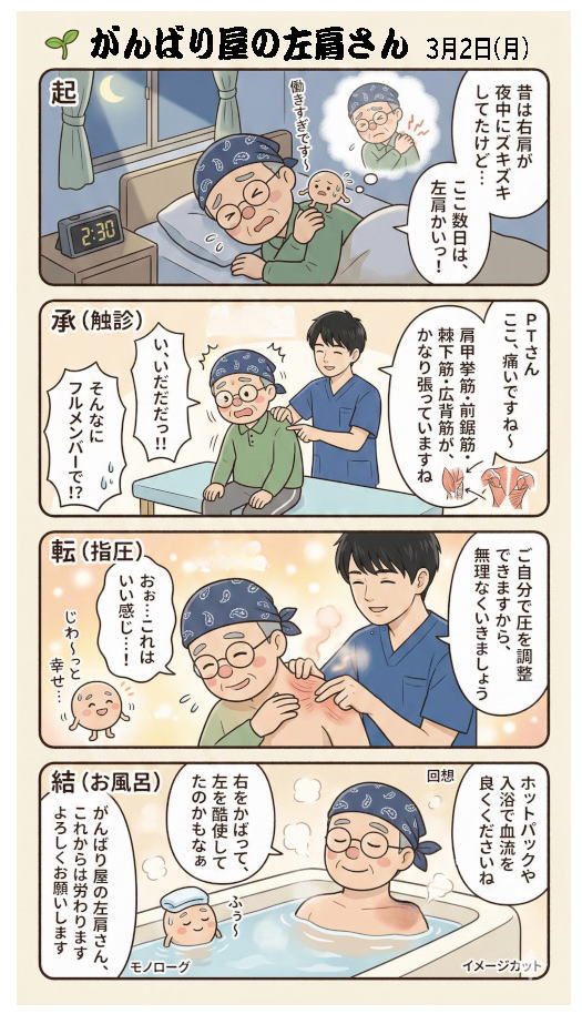 ところがここ4、5日、麻痺のない左肩から肩甲骨の下あたりに痛みが出てきました。横になって寝ると、夜中に痛みで目が覚めてしまうほどです。麻痺側をかばって、左腕を酷使しすぎてしまったのかもしれません。自分では原因がわからず不安でした。