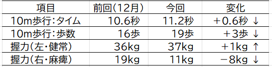 12月の前回測定と比べると、タイムは10.6秒から11.2秒へと0.6秒遅くなり、歩数も16歩から19歩へと3歩増えてしまいました。