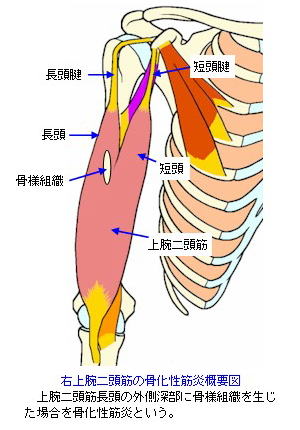 上腕二頭筋短頭腱のあたりを指圧されると、強い痛みが走ります。説明によると、「短頭腱(力こぶの内側、烏口突起に付着する部分)に過度な負荷がかかり、繰り返し強い牽引力が加わることで炎症が起きる――骨化性筋炎の疑いがあります。安静が最善の治療法です」とのこと。