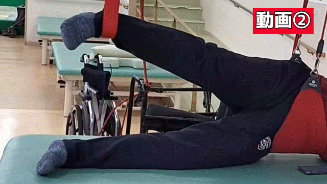 麻痺脚をレッドコードで固定して健脚を上げる・保持する(10秒、20秒)、リラックスするため吊るされた脚を振る運動も入れながら行いました。30分で汗だくになるほど見た目以上にきつい運動です。その後体勢を替え、健脚を固定し麻痺脚の動きのパターンで行いました。30分は持たなかったため20分で終了しました。