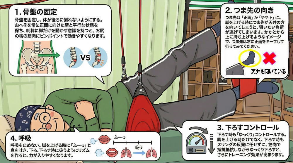 マシンが終わると、個別ケアの声がけがありました。今日は先週と同じ、横向きの姿勢(側臥位)でスリングを使って腰と足首を支え、上の脚を引き上げる中殿筋ターゲットのスイングセラピーです。