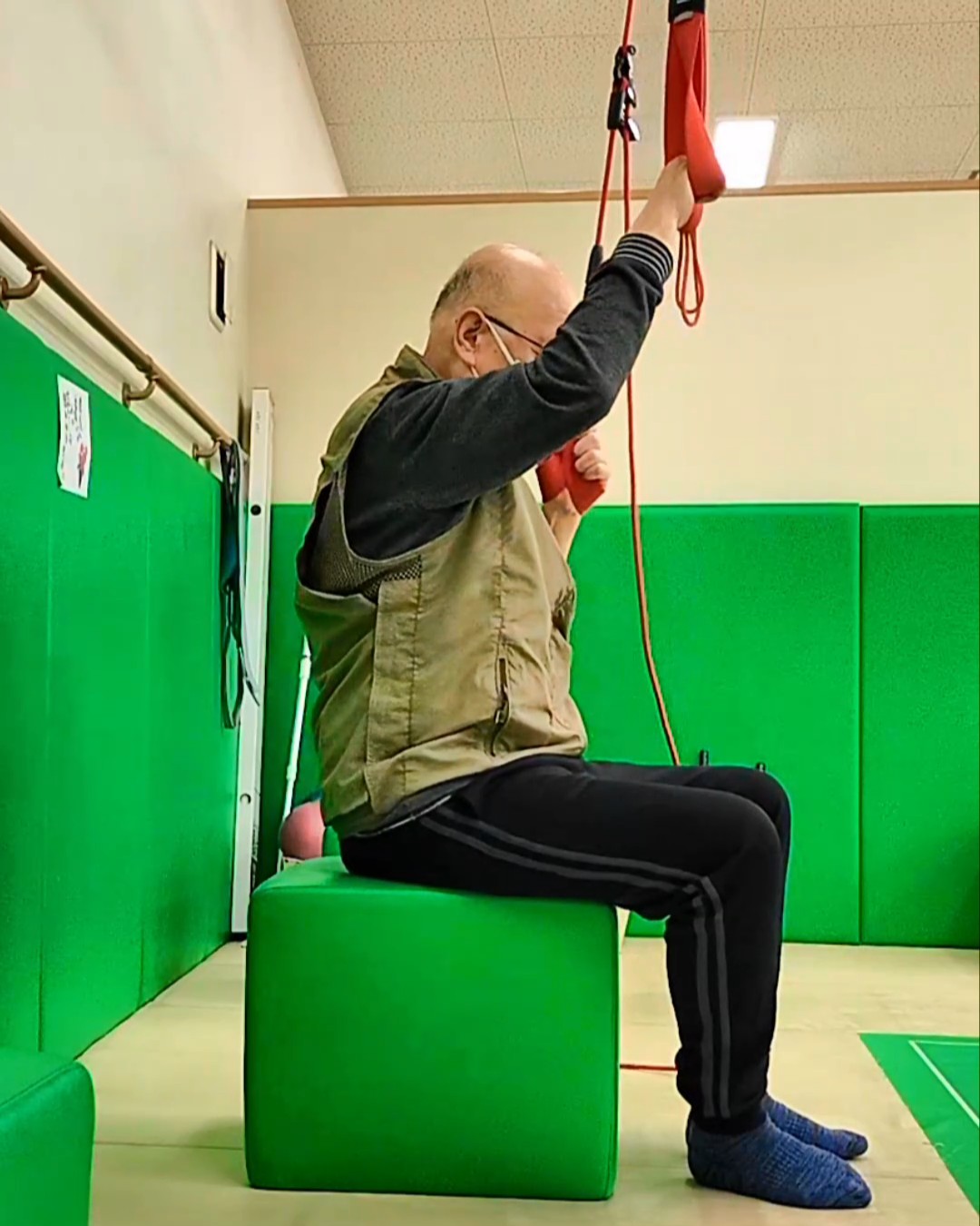 最後はプーリーを行いました。今回は横からの動画を撮影して確認してみました。思ったほど右麻痺の腕が上がっておらず、これからは徐々に椅子の位置を前にずらして、腕が垂直に伸びるよう続けていきたいと思います。時間は5分を1セットとして、2セット行うようにしたいと考えています。
