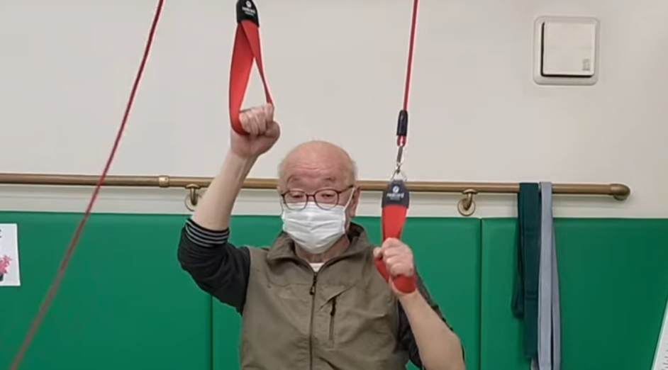 最後はプーリー運動を5分間、2セット行いました。横からの画像を見ると、麻痺している右腕が「くの字」の状態になっていますが、プーリーを続けることで、少しでも腕を伸ばしていけるよう努力したいです。