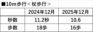 最大歩行速度は、転倒の危険性を予測する重要な指標と言われています。目標である10秒を切ることができず、担当セラピストからは「歩幅は18歩から16歩に改善されています。次は回転速度を上げることが目標達成につながるはずです。そのためには、マシンによる筋力強化が必要になります」とアドバイスをいただきました。