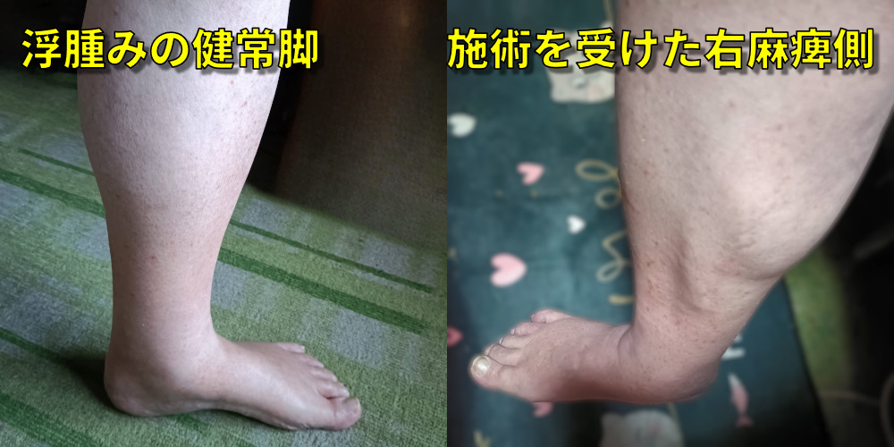 翌朝、起きるときにいつもの足の怠さが感じられず、麻痺足が軽くなったような感覚がありました。見ると、施術を受けた麻痺足側は浮腫みが少し消えて筋肉の凹凸が現れています。施術を受けていない健常足は浮腫んだままでした。