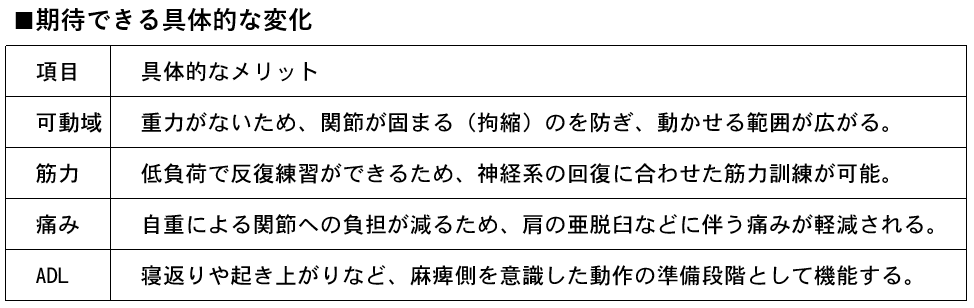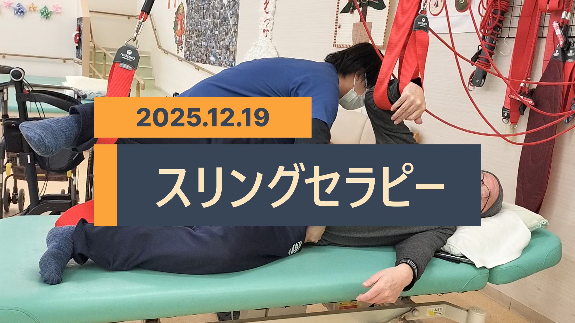 本日のリハビリは、スリングセラピーから始まりました。今回は横向きの姿勢で、麻痺側の腕と下肢をレッドコードで吊るす方法で行いました。