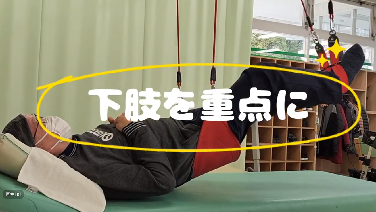 有酸素運動を終えたところで個別ケアの声がかかり、レッドコードで下肢を重点としたスリングセラピーをお願いしました。